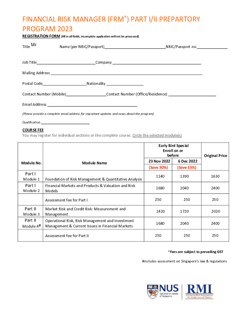 Get the free Financial Risk Manager (frm®) Part I/ii Prepartory Program 2023 Registration Form - ...