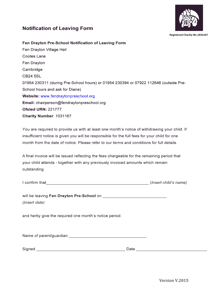 Get the free Notification of Leaving Form Registered Charity No - fendraytonpreschool