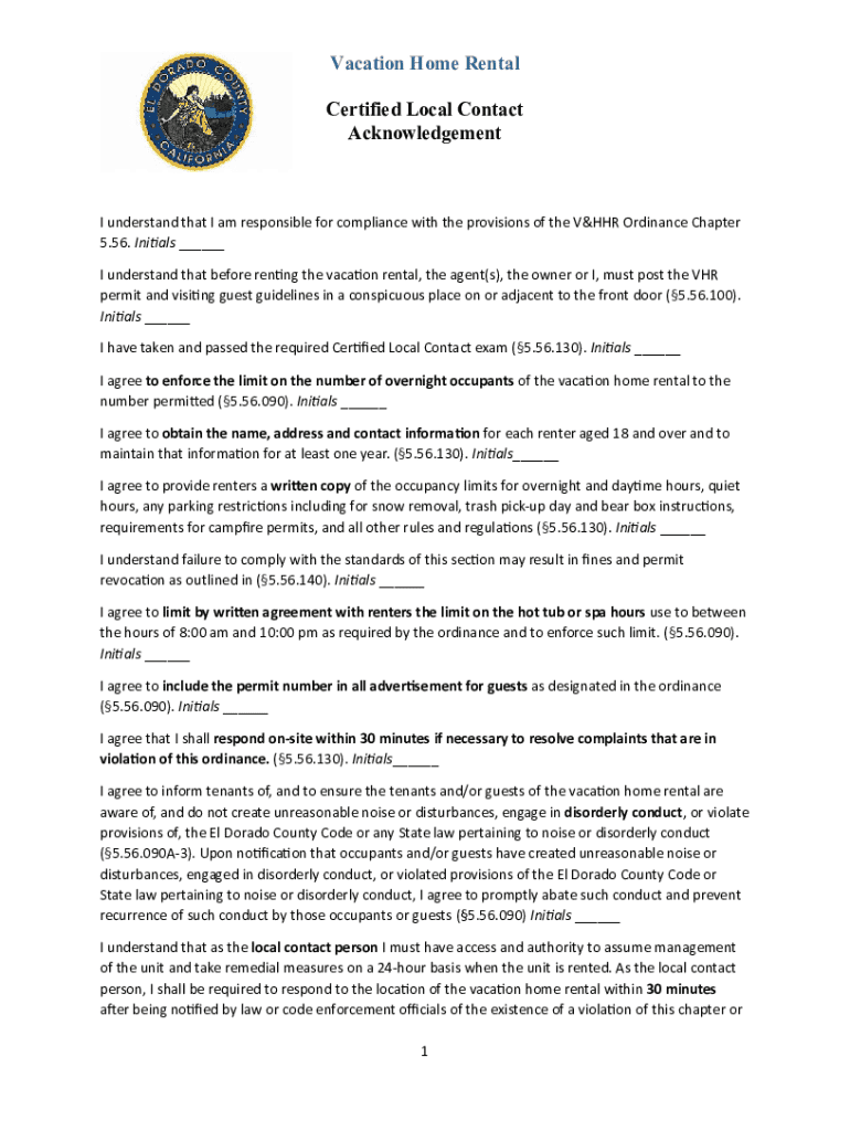 Este documento es un reconocimiento por parte del contacto local certificado de su responsabilidad de cumplir con las disposiciones del capítulo V&HHR Ordinance, lo que incluye el registro de ocupantes, cumplir con límites específicos de ruido y incumbencias, y asegurar el cumplimiento de las normas del Condado de El Dorado.