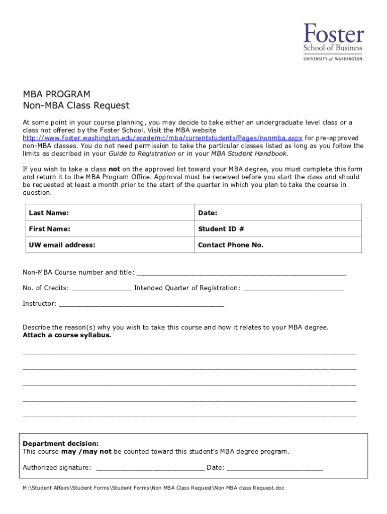 This form is to request approval for enrolling in a non-MBA class or an undergraduate level class that is not offered by the Foster School. Students must complete this form if the class is not on