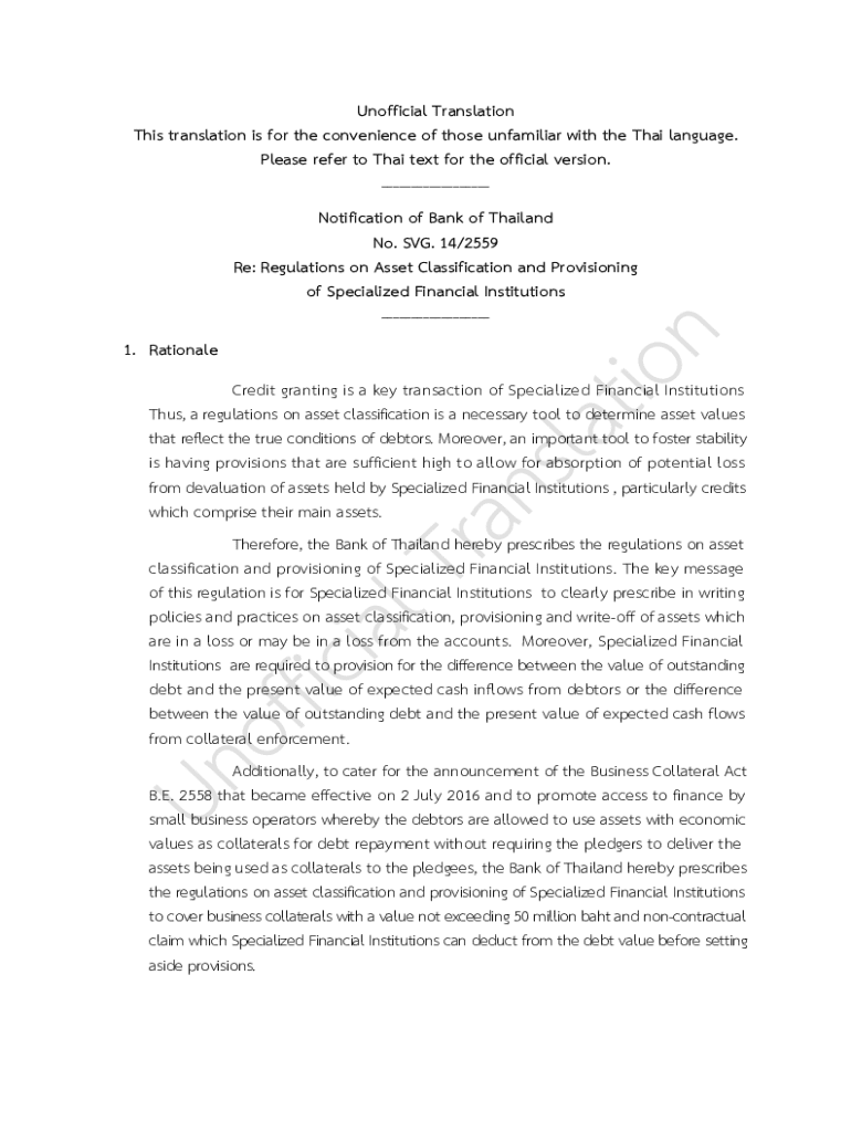 Unofficial Translation This translation is for the convenience of those unfamiliar with the Thai language. Please refer to Thai text for the official version. ___Notification of Bank of Thailand No. SVG. 14/2559 Re: Regulations on Asset Classification and Provisioning of Specialized Financial Institutions ___1. Rationale Credit granting is a key transaction of Specialized Financial Institutions Thus, a regulations on asset classification is a necessary tool to determine asset values that...