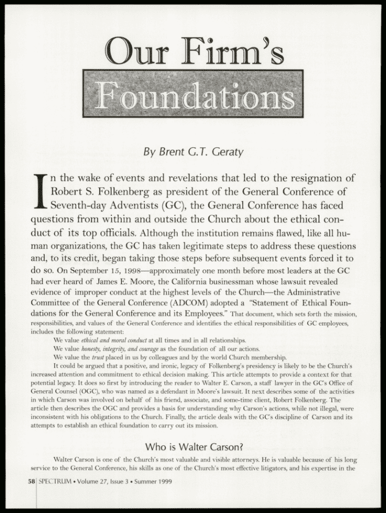 By Brent C.T. Geratyn the wake of events and revelations that led to the resignation of Robert S. Folkenberg as president of the General Conference of JL Seventhday Adventists (GC), the General Conference has faced questions from within and outside the Church about the ethical conduct of its top officials. Although the institution remains flawed, like all human organizations, the G C has taken legitimate steps to address these questions and, to its credit, began taking those steps before...