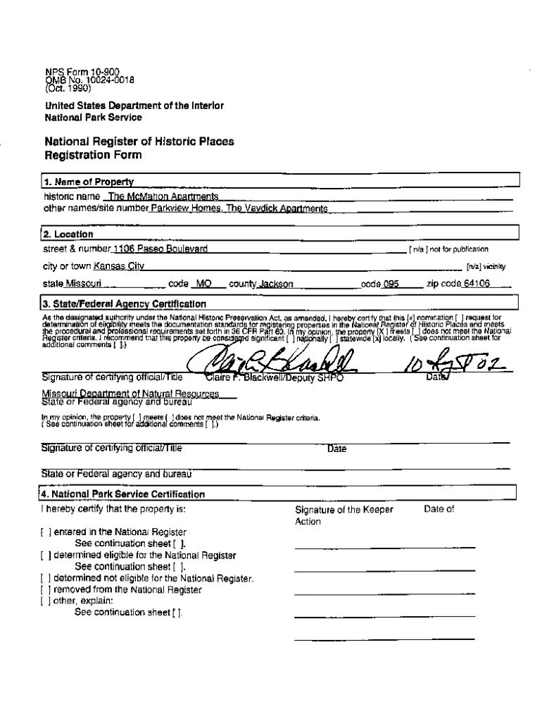 The McMahon Apartments, located at 1106 Paseo Boulevard in Kansas City, Missouri, is significant for its architectural style representing early 20th-century apartment buildings. Constructed in 1913,