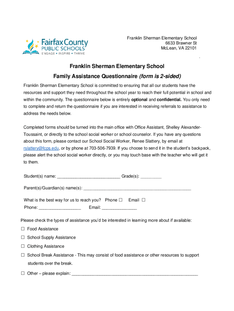 Franklin Sherman Elementary School\'s optional and confidential questionnaire designed to connect families with resources and assistance to support students\' needs throughout the school year.