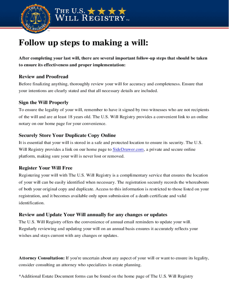 Follow up steps to making a will: After completing your last will, there are several important followup steps that should be taken to ensure its effectiveness and proper implementation:Review and Proofread Before finalizing anything, thoroughly review your will for accuracy and completeness. Ensure that your intentions are clearly stated and that all necessary details are included.Sign the Will Properly To ensure the legality of your will, remember to have it signed by two witnesses who are