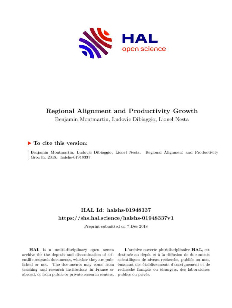 Regional Alignment and Productivity Growth Benjamin Montmartin, Ludovic Dibiaggio, Lionel NestaTo cite this version: Benjamin Montmartin, Ludovic Dibiaggio, Lionel Nesta. Growth. 2018. halshs01948337Regional Alignment and ProductivityHAL Id: halshs01948337 https://shs.hal.science/halshs01948337v1 Preprint submitted on 7 Dec 2018HAL is a multidisciplinary open access archive for the deposit and dissemination of scientific research documents, whether they are published or not. The