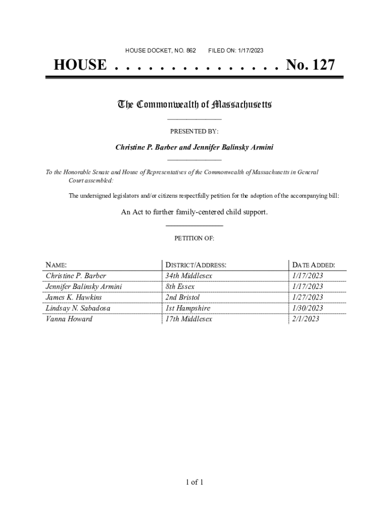HOUSE DOCKET, NO. 862FILED ON: 1/17/2023HOUSE . . . . . . . . . . . . . . . No. 127 The Commonwealth of Massachusetts ___ PRESENTED BY:Christine P. Barber and Jennifer Balinsky Armini ___ To the Honorable
