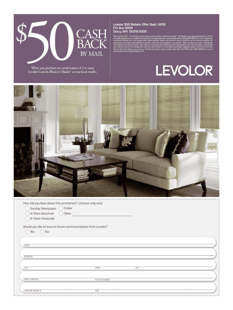 50$CASH BACK BY MAILLevolor $50 Rebate Offer Dept. 6638 P.O. Box 5009 Stacy, MN 550785009 Offer valid 9/1/09 12/31/09 purchase date must be clearly marked on receipt**. All rebates must be postmarked by 1/15/10 to qualify. Rebate forms available at www.levolor.com/getinspired or can be obtained by calling 8885886534. Limit 1 rebate per household. Rebate form and original valid, dated register receipt with product clearly marked must be received together for redemption. Price...