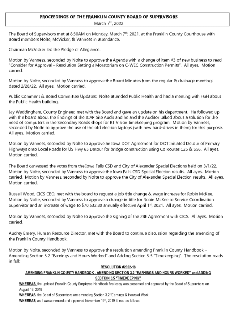 PROCEEDINGS OF THE FRANKLIN COUNTY BOARD OF SUPERVISORS March 7th, 2022 The Board of Supervisors met at 8:30AM on Monday, March 7th, 2021, at the Franklin County Courthouse with Board members Nolte, McVicker, & Vanness in attendance. Chairman McVicker led the Pledge of Allegiance. Motion by Vanness, seconded by Nolte to approve the Agenda with a change of item #3 of new business to read Consider for Approval Resolution Setting a Moratorium on CWEC Construction Permits. All ayes. Motion carried