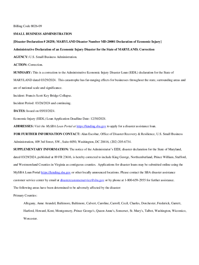 Billing Code 802609 SMALL BUSINESS ADMINISTRATION [Disaster Declaration # 20258; MARYLAND Disaster Number MD20001 Declaration of Economic Injury] Administrative Declaration of an Economic Injury Disaster for the State of MARYLAND; Correction AGENCY: U.S. Small Business Administration. ACTION: Correction. SUMMARY: This is a correction to the Administrative Economic Injury Disaster Loan (EIDL) declaration for the State of MARYLAND dated 03/29/2024. This catastrophe has farranging effects for...