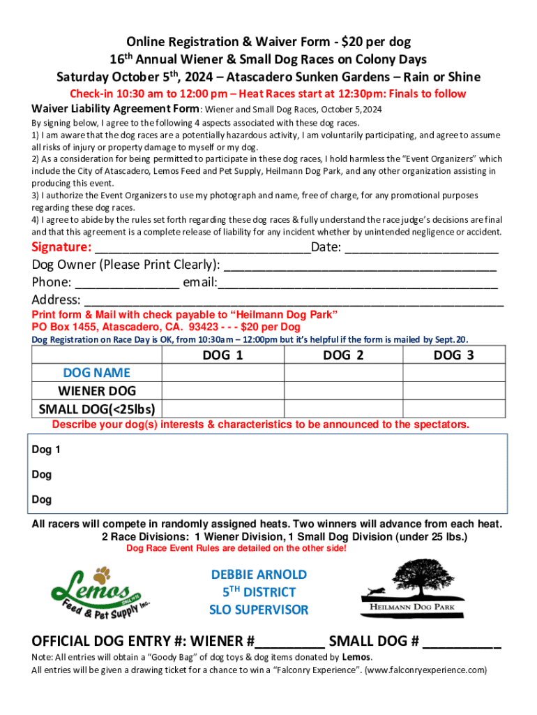 This form is for registering dogs to participate in the 16th Annual Wiener & Small Dog Races occurring on October 5, 2024. It includes a waiver liability agreement and details about the event.