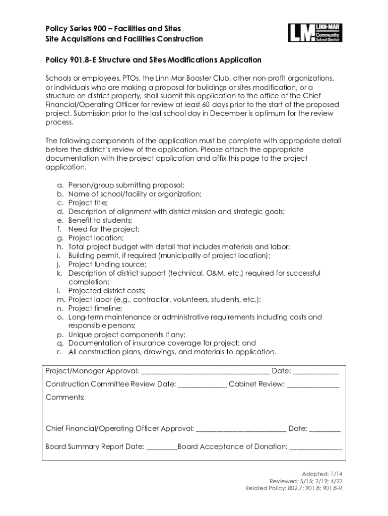 Get the free Policy 901.8-e Structure and Sites Modifications Application - policy linnmar k12 ia