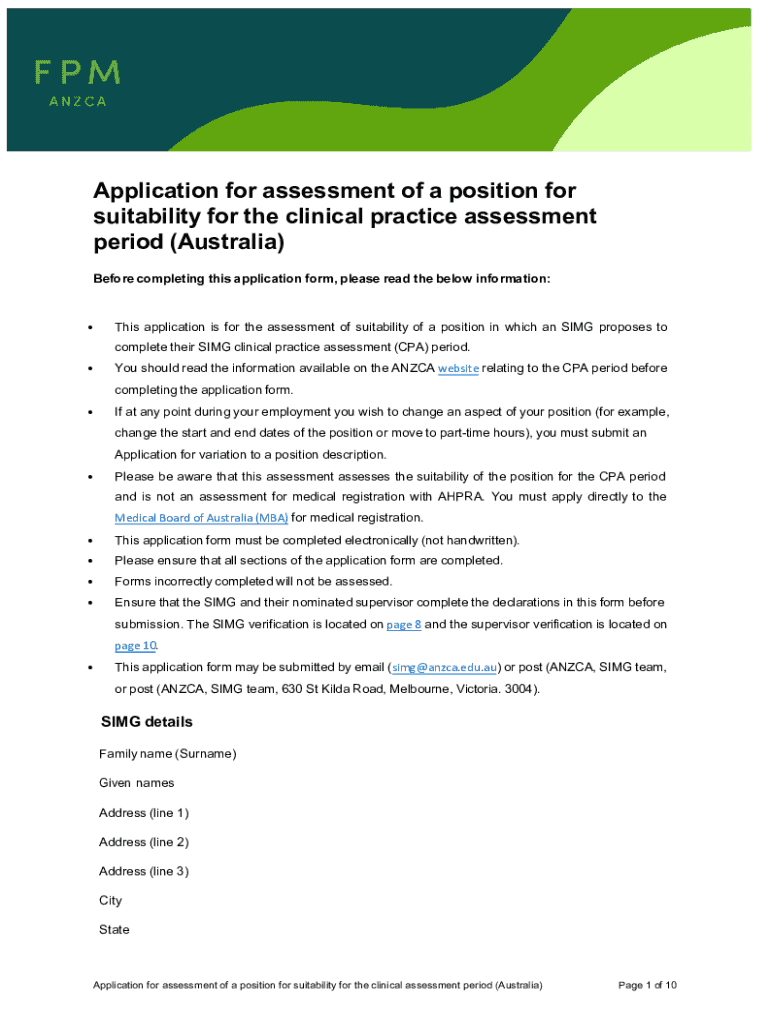 Get the free Application for Assessment of a Position for Suitability for the Clinical Practice A...