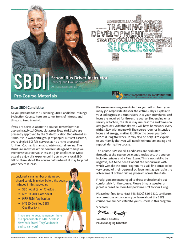 Este curso tiene como objetivo evaluar a los candidatos potenciales para la certificación SBDI (Instructor de Conductor de Autobús Escolar) del Estado de Nueva York, mientras se proporciona capacitación