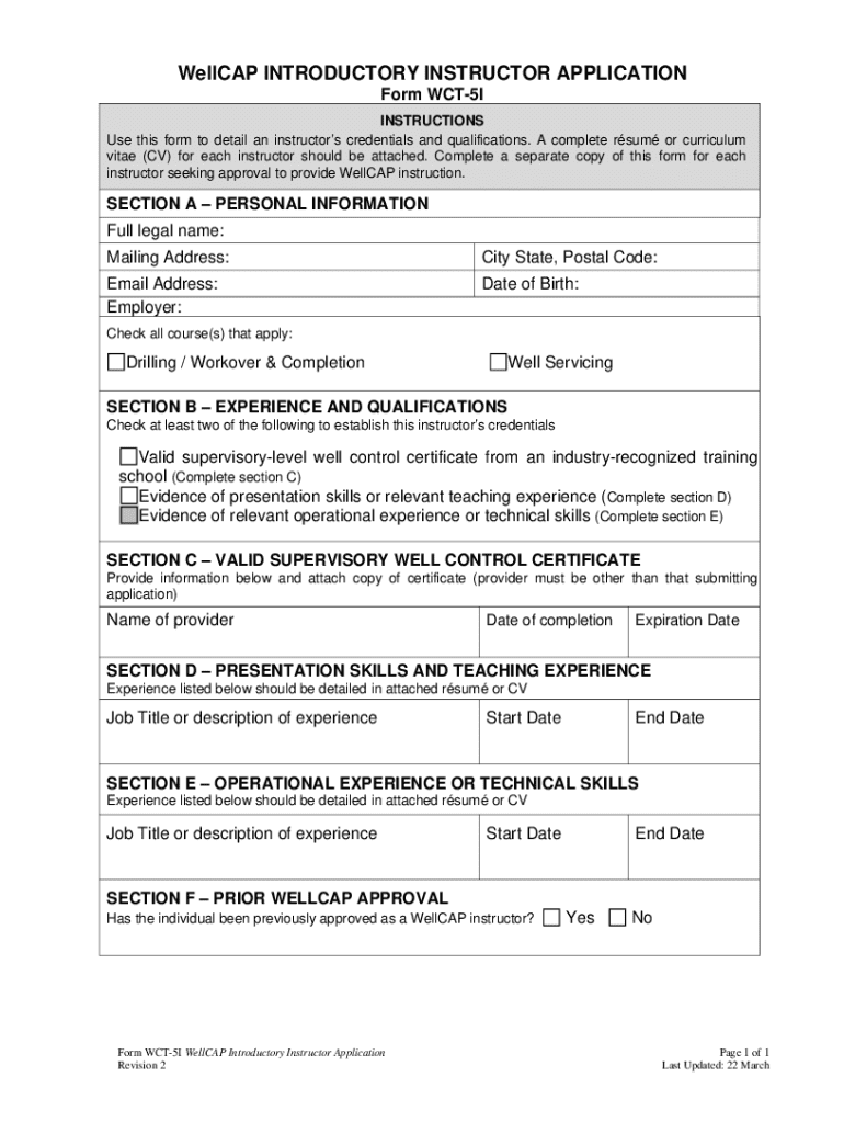 Este formulario se utiliza para detallar las credenciales y calificaciones de un instructor que busca aprobación para proporcionar instrucción WellCAP. Se debe adjuntar un currículum o currículum vitae (CV) completo para cada instructor.