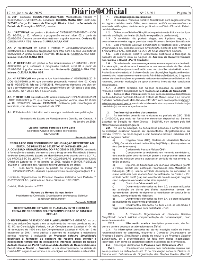 17 de janeiro de 2025Dirio Oficialde 2011; processo: SEDUCPRO2023/71486, Manifestao Tcnica n 03501/2024/GCVF/SEPALG, servidora: CLEUSA MARA OST, matrcula: 74754/3 Cargo: Professor da Educao Bsica,