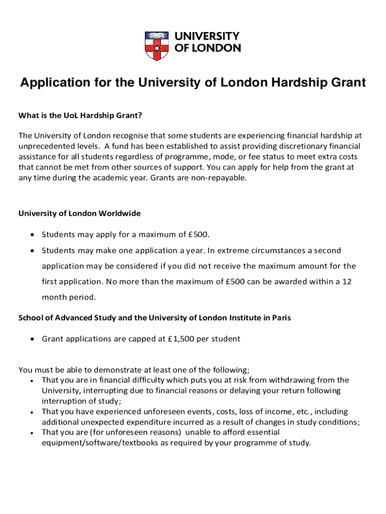Este formulario permite a los estudiantes de la Universidad de Londres solicitar asistencia financiera en tiempos de dificultades económicas. El fondo proporciona apoyo discrecional no reembolsable para ayudar a cubrir costos adicionales que no pueden ser cubiertos por otros medios.
