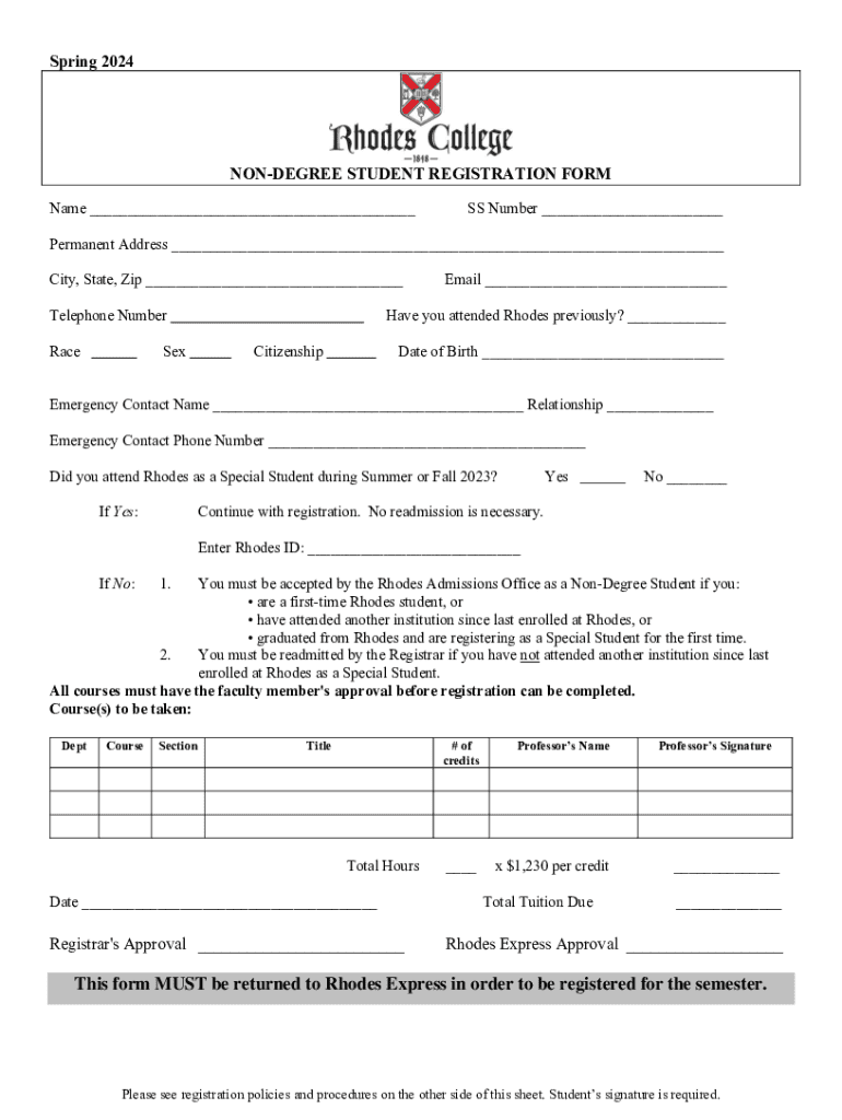 This form is used for non-degree students to register for courses at Rhodes College, detailing personal information, course selection, and agreement to abide by academic policies.