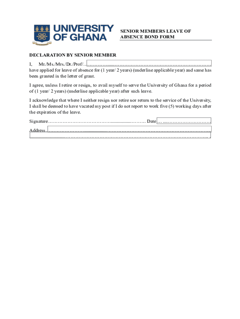 This document is a declaration form for senior members at the University of Ghana applying for a leave of absence. It outlines the conditions under which the leave is granted and the obligations of the applicant upon return.