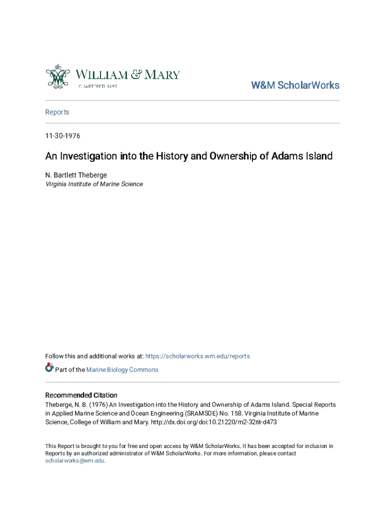 W&M ScholarWorks Reports 11301976An Investigation into the History and Ownership of Adams Island N. Bartlett Theberge Virginia Institute of Marine ScienceFollow this and additional works at: https://scholarworks.wm.edu/reports Part of the Marine Biology CommonsRecommended Citation Theberge, N. B. (1976) An Investigation into the History and Ownership of Adams Island. Special Reports in Applied Marine Science and Ocean Engineering (SRAMSOE) No. 158. Virginia Institute of Marine Science,...