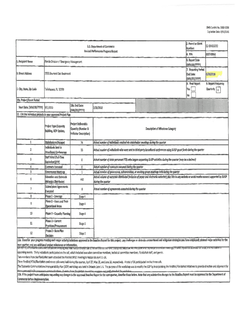 This report outlines the performance progress of the Florida Division of Emergency Management in relation to the SLIGP grant, detailing milestones achieved, stakeholder engagement, project deliverables,