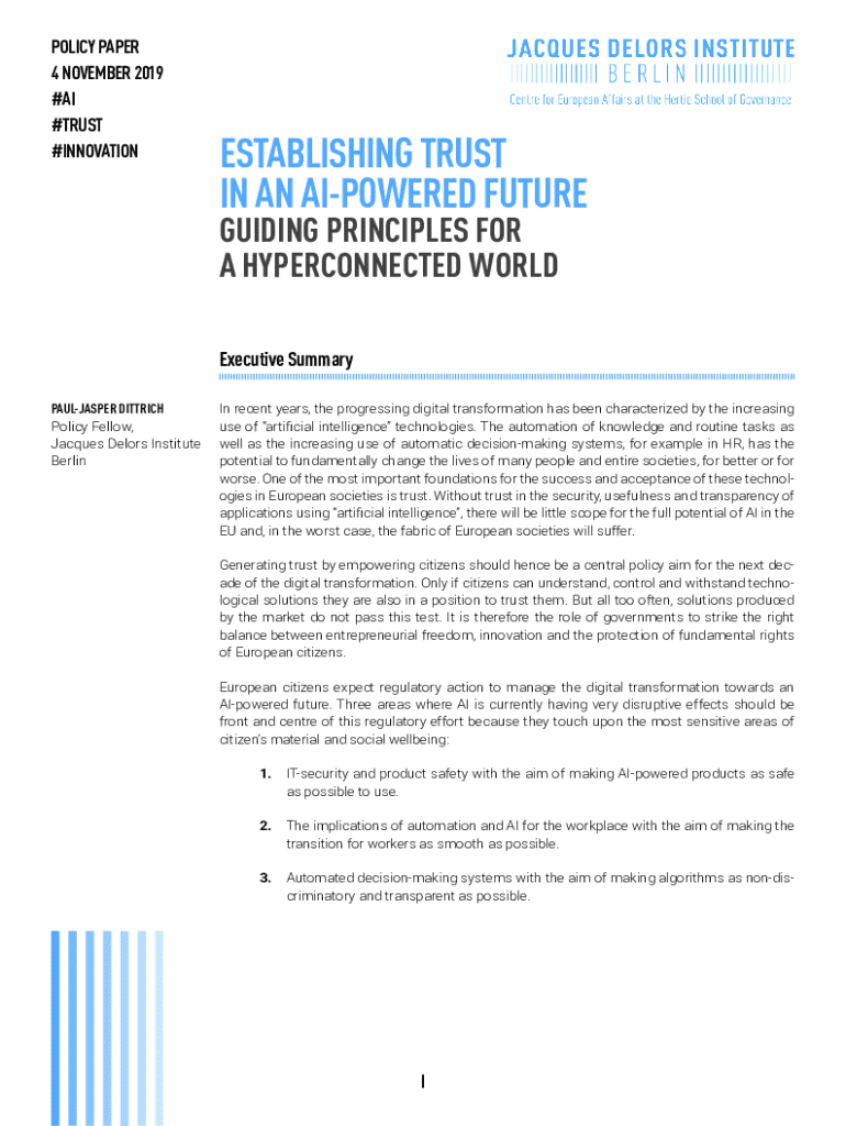 Policy paper 4 November 2019 #AI #Trust #InnovationEstablishing Trust in an AIpowered future Guiding principles for a hyperconnected world Executive SummaryPaulJasper Dittrich Policy Fellow, Jacques Delors Institute BerlinIn recent years, the progressing digital transformation has been characterized by the increasing use of artificial intelligence technologies. The automation of knowledge and routine tasks as well as the increasing use of automatic decisionmaking systems, for example