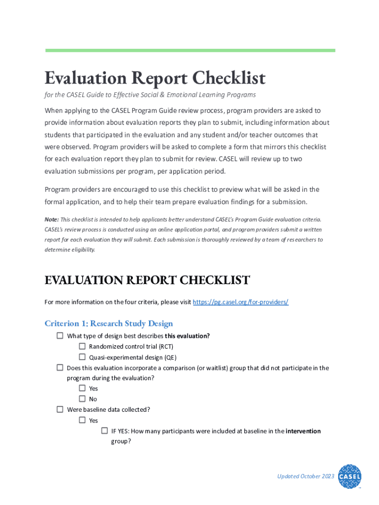 This checklist is designed for program providers applying to the CASEL Program Guide review process, offering guidance on the evaluation reports required for submission, including details on study