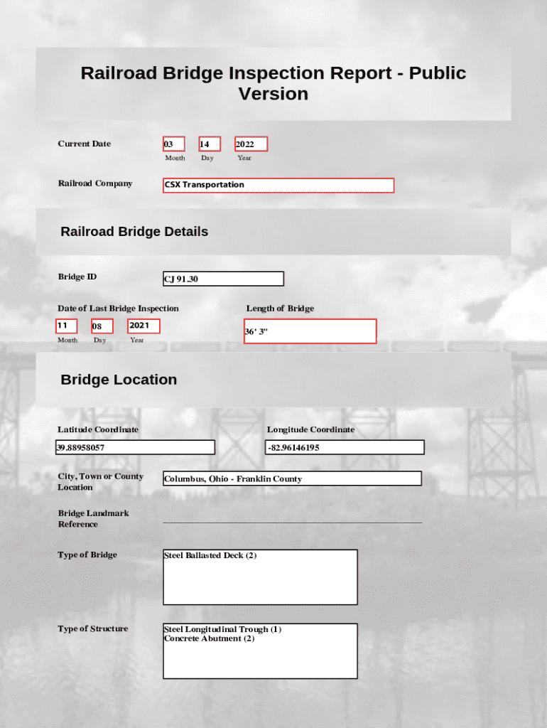 Current Date03142022MonthDayYearRailroad CompanyCSX TransportationBridge IDCJ 91.30Date of Last Bridge Inspection11082021MonthDayYearLength of Bridge36\' 3\"Latitude CoordinateLongitude Coordinate39.8895805782.96146195City,