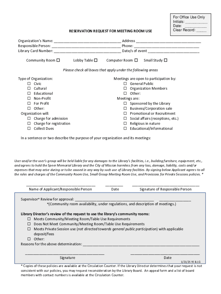 This form is used to request the use of meeting rooms at the library, detailing the organization\'s name, responsible person, type of organization, purpose of meetings, and agreeing to library policies