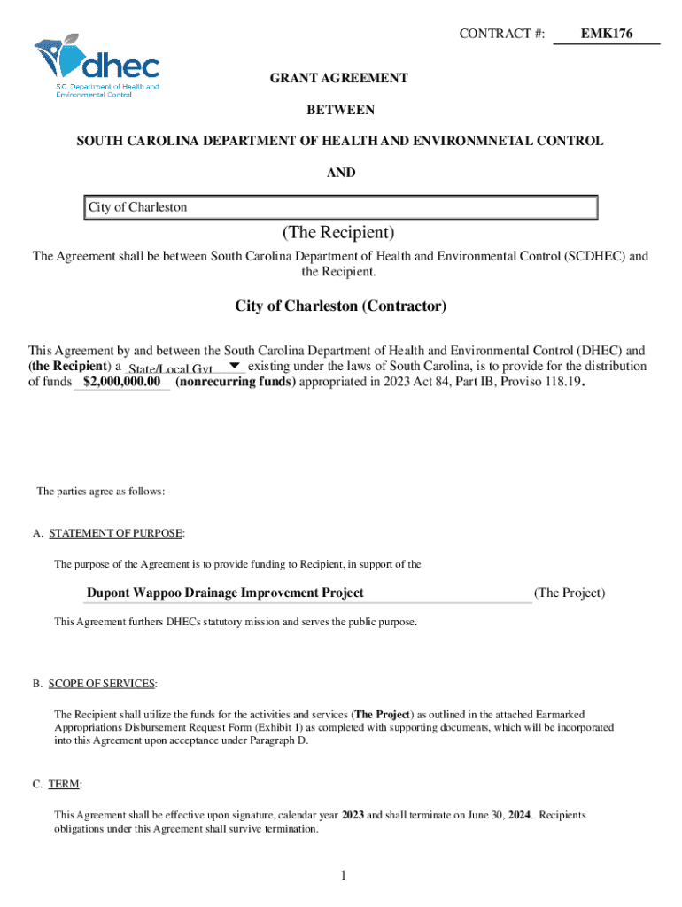 CONTRACT #:EMK176GRANT AGREEMENT BETWEEN SOUTH CAROLINA DEPARTMENT OF HEALTH AND ENVIRONMNETAL CONTROL AND City of Charleston(The Recipient) The Agreement shall be between South Carolina Department