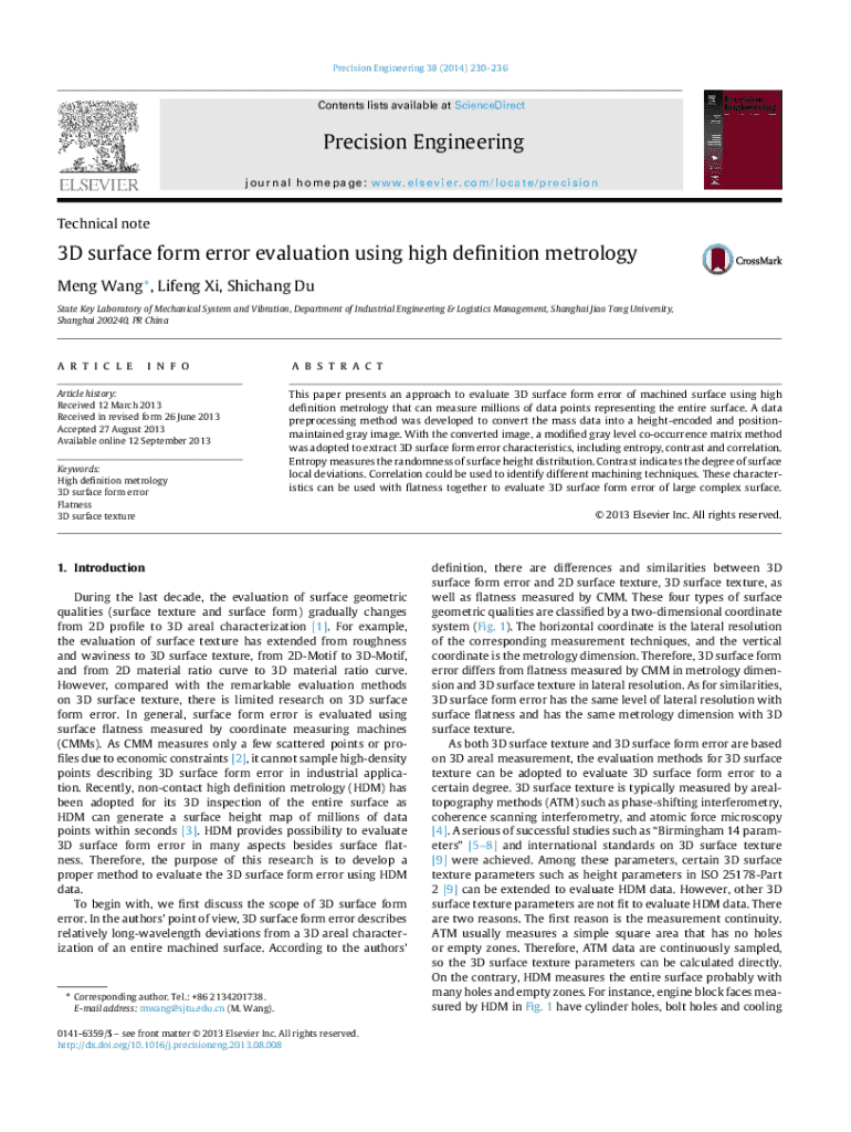 Precision Engineering 38 (2014) 230236Contents lists available at ScienceDirectPrecision Engineering journal homepage: www.elsevier.com/locate/precisionTechnical note3D surface form error evaluation