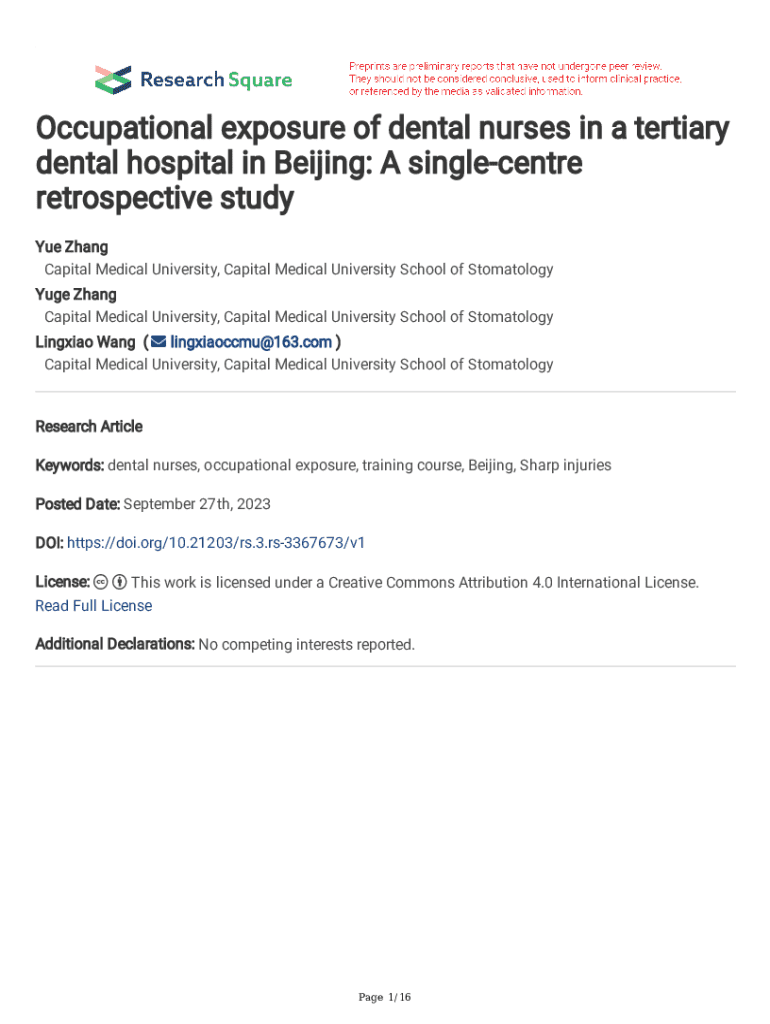 Occupational exposure of dental nurses in a tertiary dental hospital in Beijing: A singlecentre retrospective study Yue Zhang Capital Medical University, Capital Medical University School of Stomatology