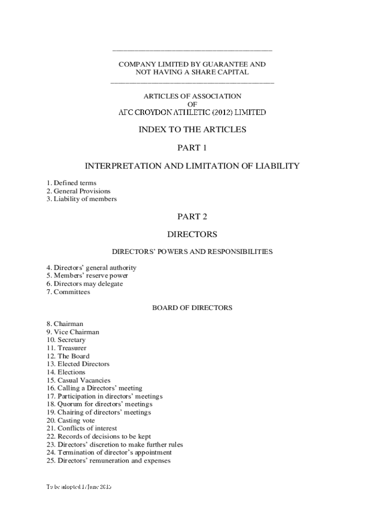 ___ COMPANY LIMITED BY GUARANTEE AND NOT HAVING A SHARE CAPITAL ___ ARTICLES OF ASSOCIATION OFINDEX TO THE ARTICLES PART 1 INTERPRETATION AND LIMITATION OF LIABILITY 1. Defined terms 2. General Provisions 3. Liability of membersPART 2 DIRECTORS DIRECTORS POWERS AND RESPONSIBILITIES 4. Directors general authority 5. Members reserve power 6. Directors may delegate 7. Committees BOARD OF DIRECTORS 8. Chairman 9. Vice Chairman 10. Secretary 11. Treasurer 12. The Board 13. Elected Directors 14