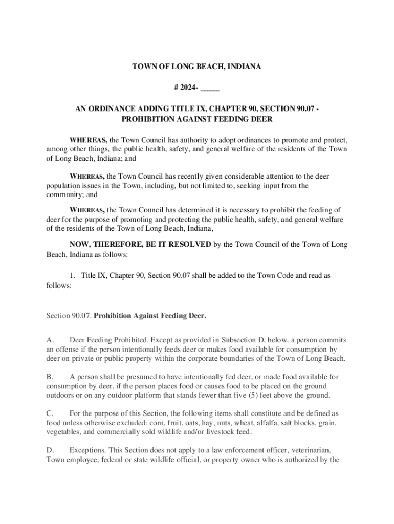 An ordinance introduced by the Town Council of Long Beach, Indiana, prohibiting the feeding of deer within the town\'s corporate boundaries to promote and protect public health, safety, and general welfare.