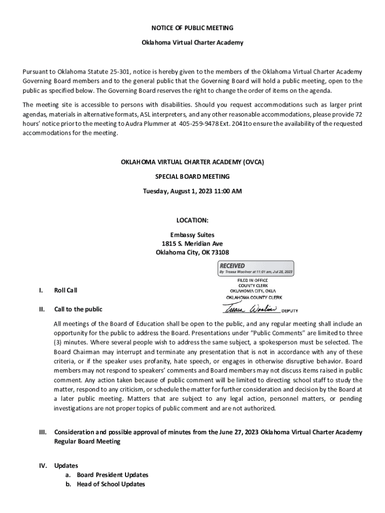 This document serves as a notice for a public meeting held by the Governing Board of the Oklahoma Virtual Charter Academy, detailing the meeting\'s accessibility, agenda, and protocols for public comments.