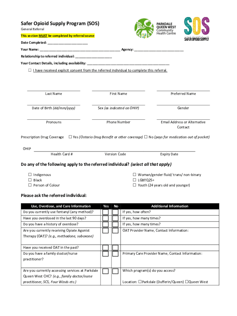 Get the free Safer Opioid Supply Program (sos) General Referral