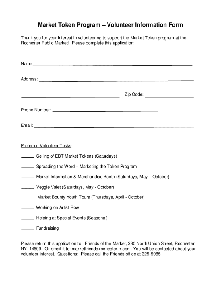 Market Token Program Volunteer Information Form Thank you for your interest in volunteering to support the Market Token program at the Rochester Public Market! Please complete this application:Name:Address:Zip Code:Phone Number:Email:Preferred Volunteer Tasks: Selling of EBT Market Tokens (Saturdays) Spreading the Word Marketing the Token Program Market Information & Merchandise Booth (Saturdays, May October) Veggie Valet (Saturdays, May October) Market Bounty Youth Tours