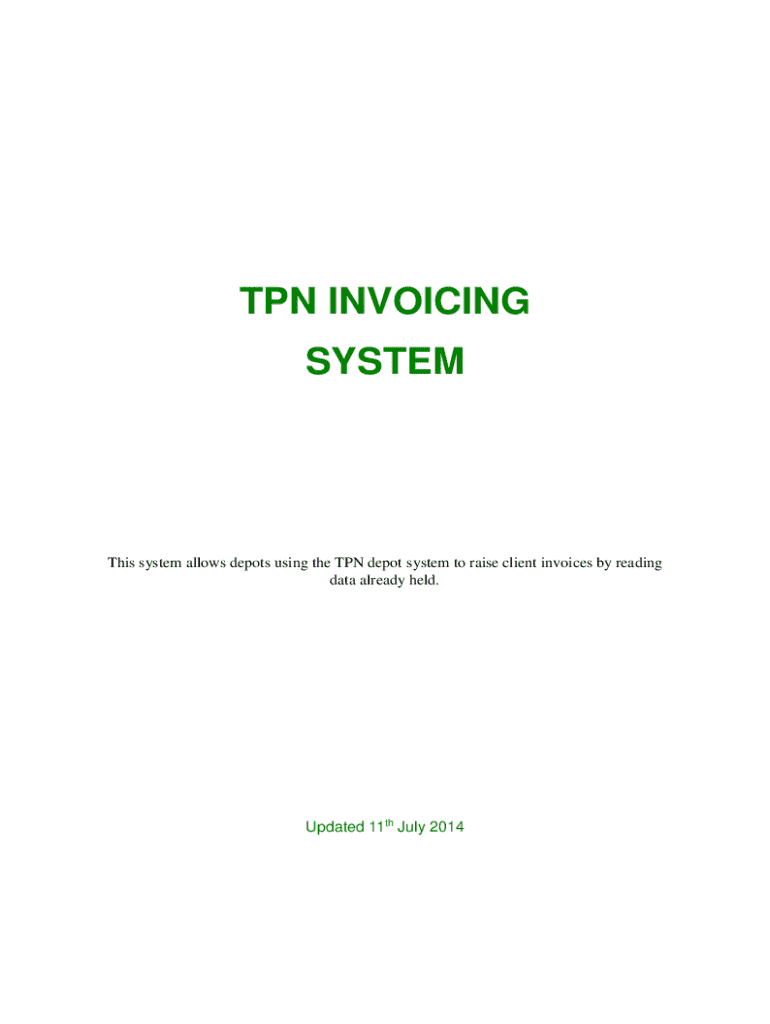 This document provides comprehensive instructions on installing, setting up, and operating the TPN Invoicing System for depots. It includes installation procedures, setup menus for regions and services, operational menus for invoicing, and report generation. The manual is designed to guide users through the various features and functionalities of the invoicing software, ensuring efficient handling of client invoices based on existing data.