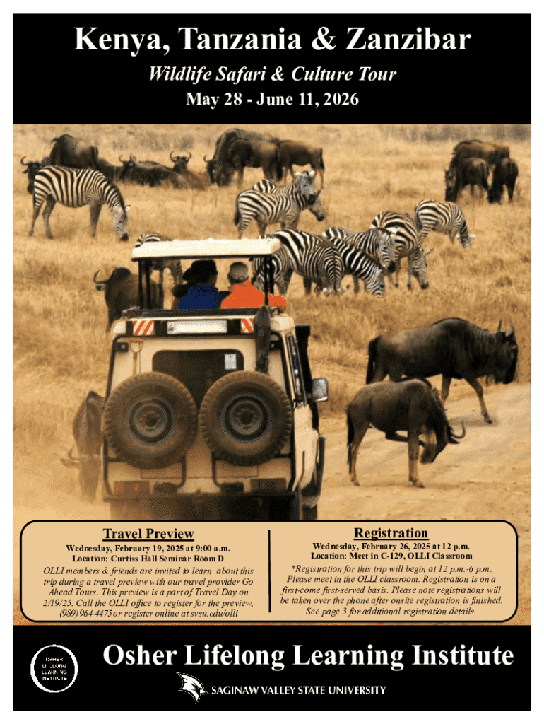 Kenya, Tanzania & Zanzibar Wildlife Safari & Culture Tour May 28 June 11, 2026Travel Preview Wednesday, February 19, 2025 at 9:00 a.m. Location: Curtiss Hall Seminar Room DOLLI members & friends are invited to learn about this trip during a travel preview with our travel provider Go Ahead Tours. This preview is a part of Travel Day on 2/19/25. Call the OLLI office to register for the preview, (989) 9644475 or register online at svsu.edu/olliRegistration Wednesday, February 26, 2025 at 12 p