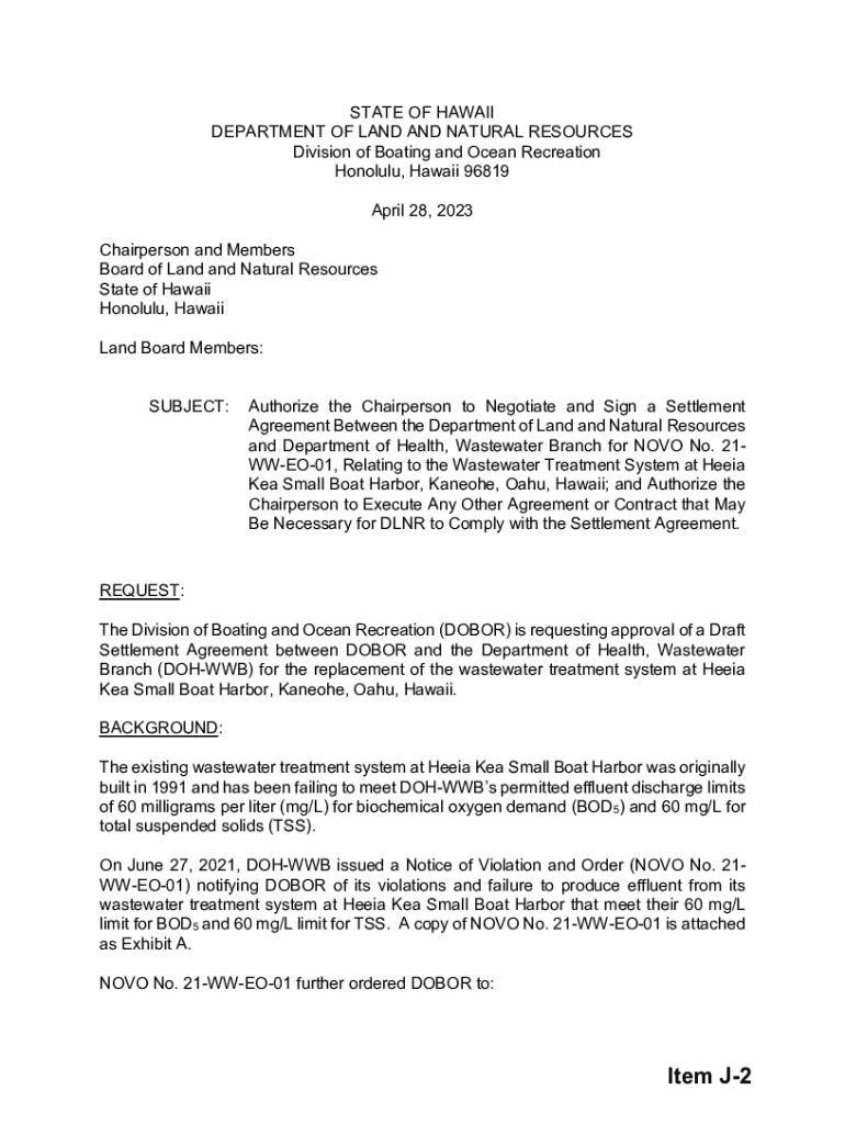 STATE OF HAWAII DEPARTMENT OF LAND AND NATURAL RESOURCES Division of Boating and Ocean Recreation Honolulu, Hawaii 96819 April 28, 2023 Chairperson and Members Board of Land and Natural Resources State of Hawaii Honolulu, Hawaii Land Board Members: SUBJECT:Authorize the Chairperson to Negotiate and Sign a Settlement Agreement Between the Department of Land and Natural Resources and Department of Health, Wastewater Branch for NOVO No. 21WWEO01, Relating to the Wastewater Treatment System at...