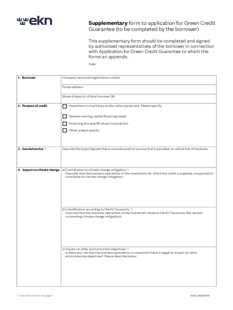 Este formulario suplementario debe ser completado y firmado por representantes autorizados del prestatario en conexión con la Solicitud de Garantía de Crédito Verde a la que este formulario es un apéndice. Incluye secciones sobre el prestatario, el propósito del crédito, el impacto en el cambio climático, la evaluación del impacto ambiental y social, y aspectos legales relacionados con la corrupción.
