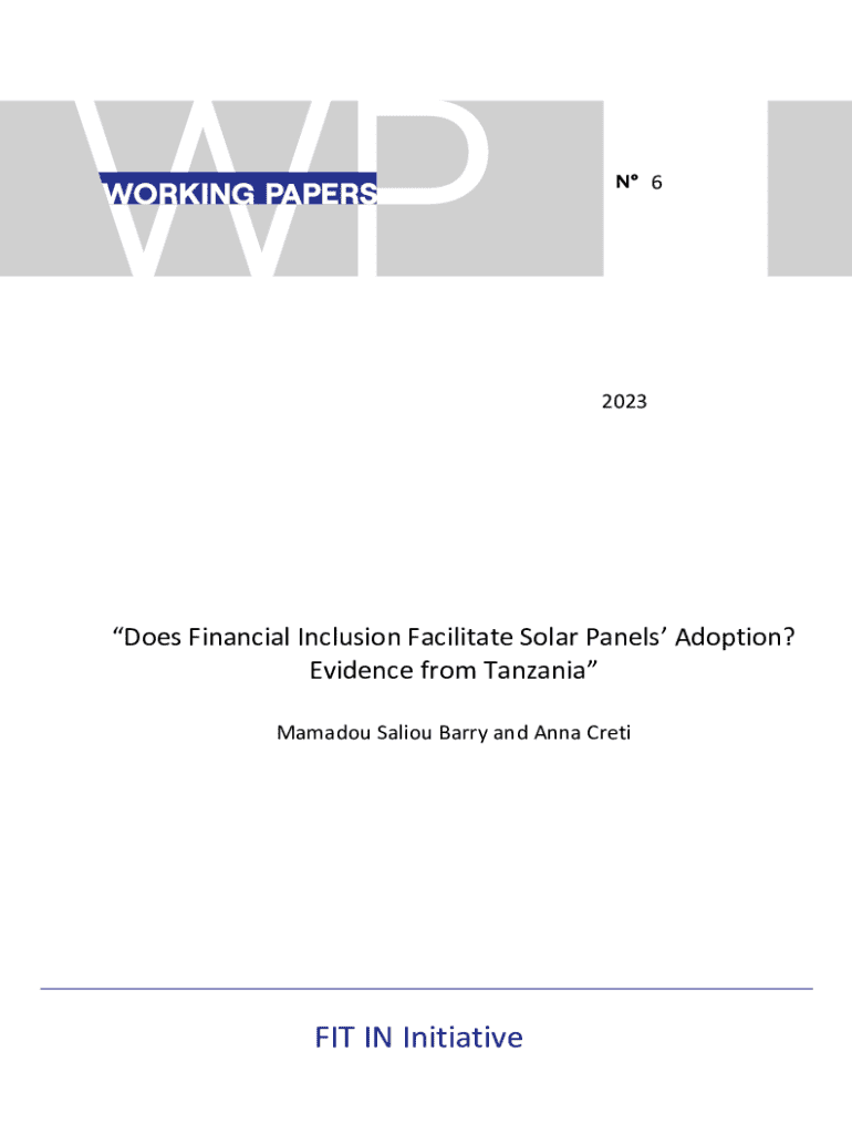 62023Does Financial Inclusion Facilitate Solar Panels Adoption? Evidence from Tanzania Mamadou Saliou Barry and Anna CretiFIT IN InitiativeDoes Financial Inclusion Facilitate Solar Panels Adoption? Evidence from Tanzania Mamadou Saliou Barry1 and Anna Creti* 11Universit Paris Dauphine PSL Research University, UMR Leda and Climate Economics Chair, Paris (France) June 6, 2023Abstract Worldwide, 820 million people still live without electricity, with SubSaharan Africa alone being home to 80% of...