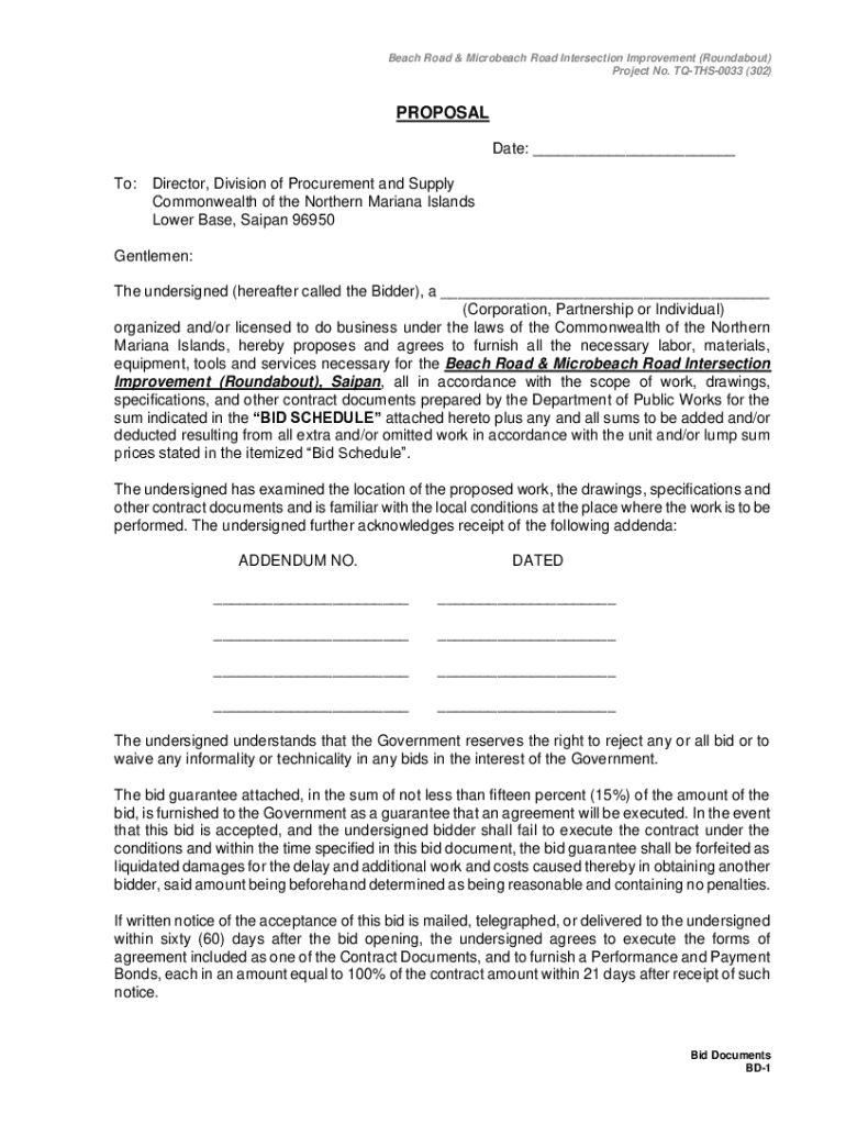 Beach Road & Microbeach Road Intersection Improvement (Roundabout) Project No. TQTHS0033 (302)PROPOSAL Date: ___ To:Director, Division of Procurement and Supply Commonwealth of the Northern Mariana Islands Lower Base, Saipan 96950Gentlemen: The undersigned (hereafter called the Bidder), a ___ (Corporation, Partnership or Individual) organized and/or licensed to do business under the laws of the Commonwealth of the Northern Mariana Islands, hereby proposes and agrees to furnish all the necessary