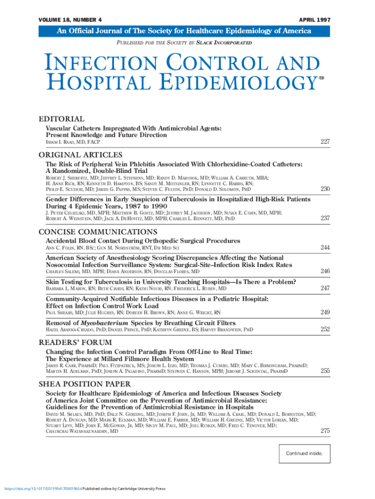 VOLUME 18, NUMBER 4APRIL 1997PUBLISHEDFOR THESOCIETYBYSLACK INCORPORATEDEDITORIAL Vascular Catheters Impregnated With Antimicrobial Agents: Present Knowledge and Future Direction 227ISSAM I. RAAD, MD, FACPORIGINAL ARTICLES The Risk of Peripheral Vein Phlebitis Associated With ChlorhexidineCoated Catheters: A Randomized, DoubleBlind Trial ROBERT J. SHERERTZ, MD; JEFFREY L. STEPHENS, MD; RANDY D. MAROSOK, MD; WILLIAM A. CARRUTH, MBA; H. ANNE RICH, RN; KENNETH D. HAMPTON, BS; SANDY M