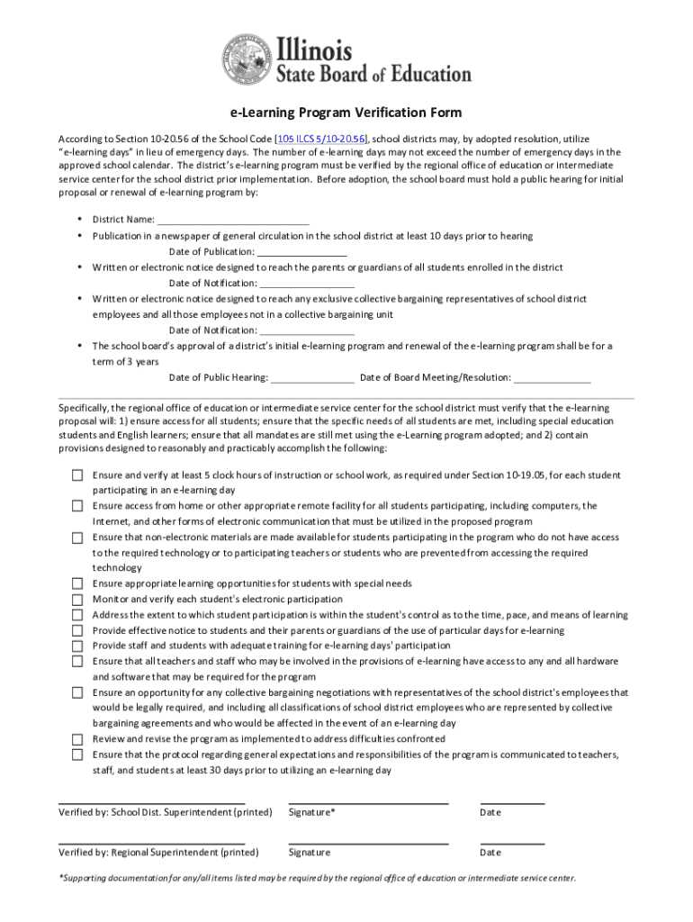 This form is used by school districts to verify their e-learning program in accordance with Section 10-20.56 of the School Code. It outlines the requirements for implementing e-learning days, including public notification, access for all students, monitoring participation, and ensuring necessary resources and training.