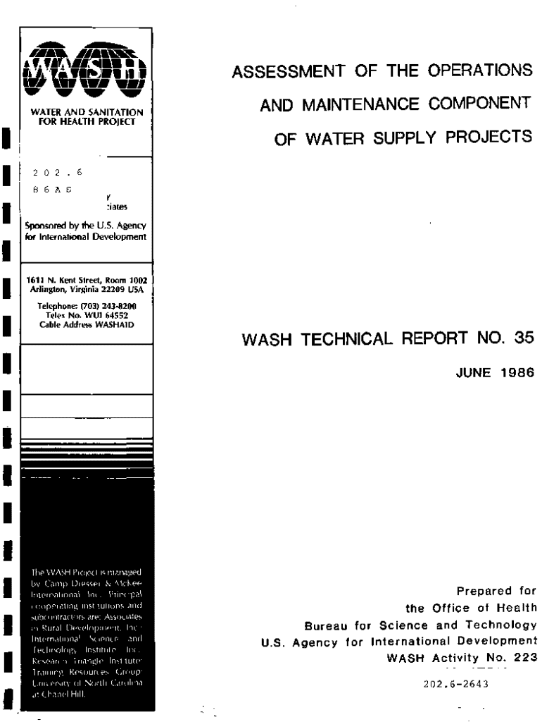 This technical report provides an assessment of the operations and maintenance (O&M) components for water supply projects, emphasizing the importance of planning for O&M to ensure the long-term success of these projects, particularly in less developed countries. It outlines critical elements for O&M, provides guidelines for assessing various types of water supply systems, and emphasizes the need for community participation and institutional support.