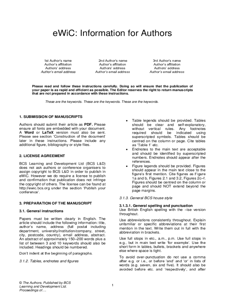 eWiC: Information for Authors1st Authors name Authors affiliation Authors address Authors email address2nd Authors name Authors affiliation Authors address Authors email address3rd Authors name Authors affiliation Authors address Authors email addressPlease read and follow these instructions carefully. Doing so will ensure that the publication of your paper is as rapid and efficient as possible. The Editor reserves the right to return manuscripts that are