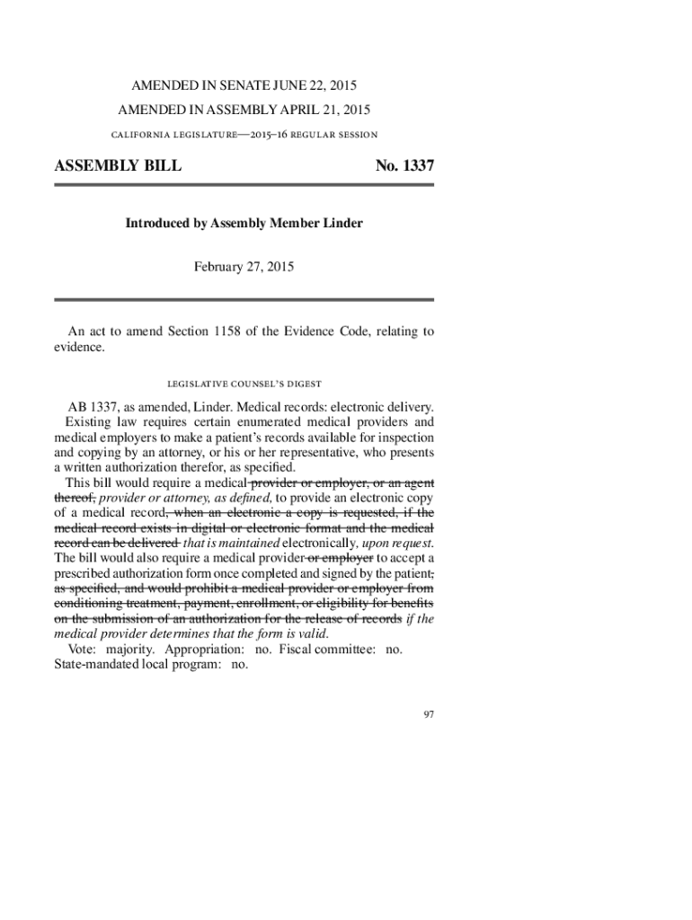 With pdfFiller, you may easily complete and sign ab 1337 online. It lets you modify original PDF material, highlight, blackout, erase, and write text anywhere on a page, legally eSign your document, and do a lot more. Create a free account to handle professional papers online.