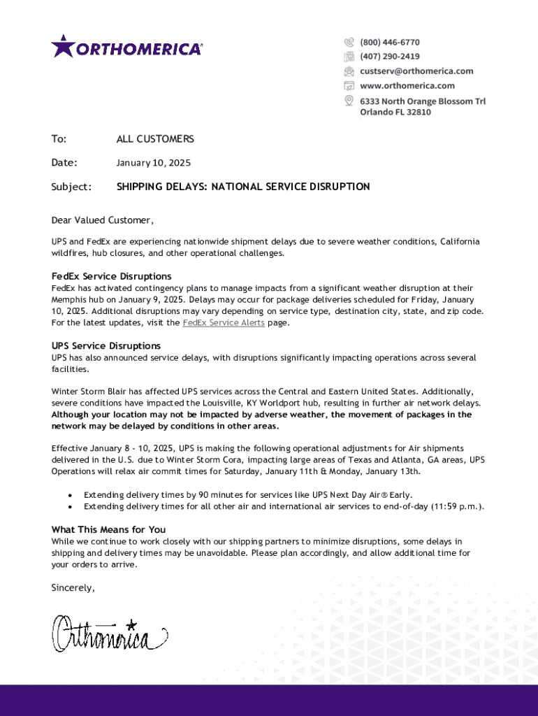 To:ALL CUSTOMERSDate:January 10, 2025Subject:SHIPPING DELAYS: NATIONAL SERVICE DISRUPTIONDear Valued Customer, UPS and FedEx are experiencing nationwide shipment delays due to severe weather conditions, California wildfires, hub closures, and other operational challenges.FedEx Service Disruptions FedEx has activated contingency plans to manage impacts from a significant weather disruption at their Memphis hub on January 9, 2025. Delays may occur for package deliveries scheduled for Friday,...