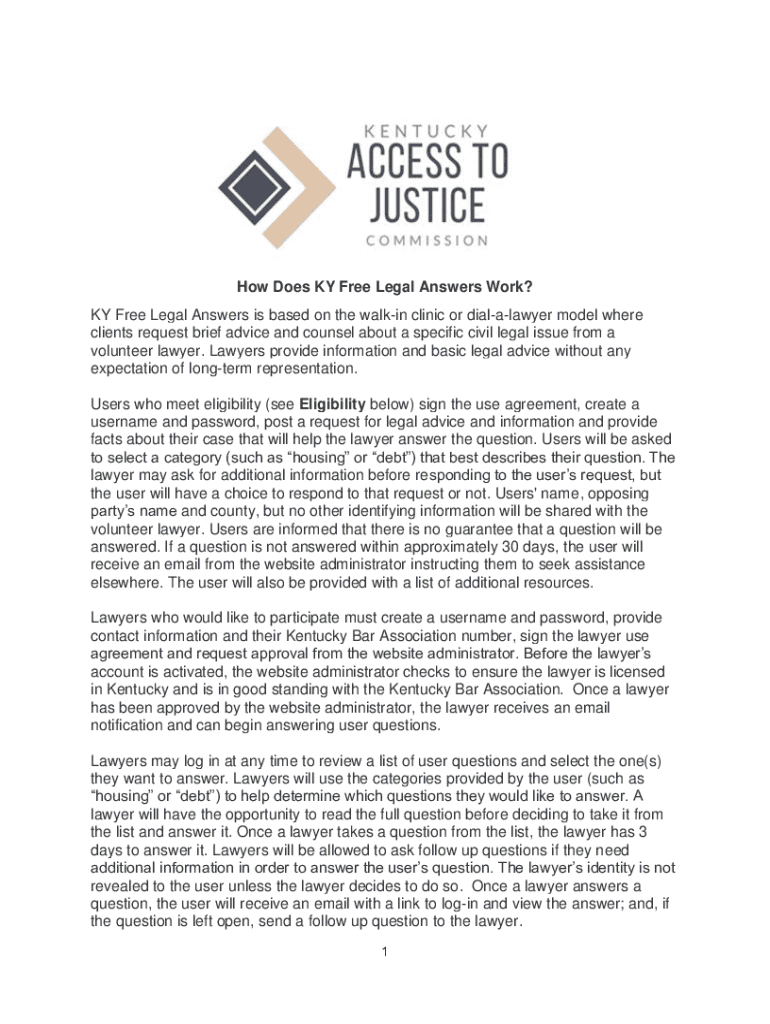 How Does KY Free Legal Answers Work? KY Free Legal Answers is based on the walkin clinic or dialalawyer model where clients request brief advice and counsel about a specific civil legal issue from a volunteer lawyer. Lawyers provide information and basic legal advice without any expectation of longterm representation. Users who meet eligibility (see Eligibility below) sign the use agreement, create a username and password, post a request for legal advice and information and provide facts about
